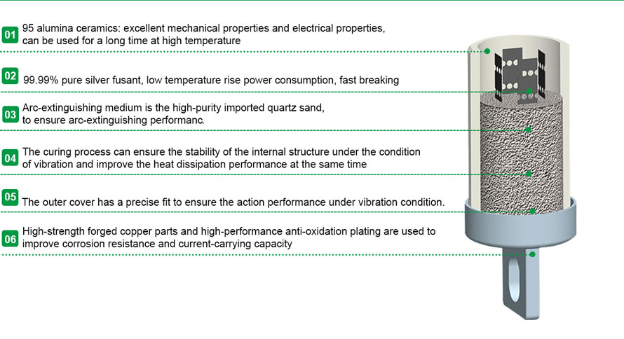 • Proceso de estructura: el metal de cobre se remacha después del proceso de soldadura; la arena de cuarzo interna se procesa por solidificación para evitar que los productos se caigan en condiciones de trabajo dinámicas y evitar la pulverización de arco causada por fallas en la línea.