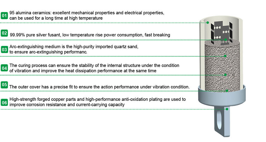 • Proceso de estructura: el metal de cobre se remacha después del proceso de soldadura; la arena de cuarzo interna se procesa por solidificación para evitar que los productos se caigan en condiciones de trabajo dinámicas y evitar la pulverización de arco causada por fallas en la línea.