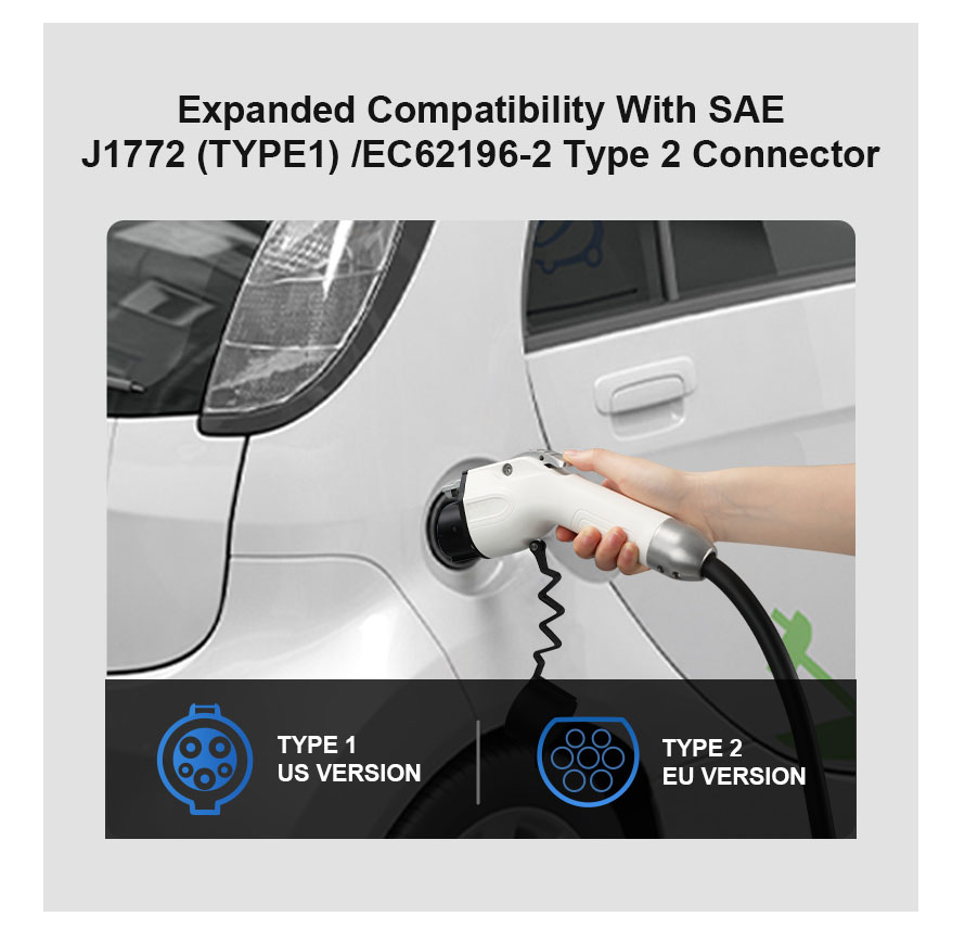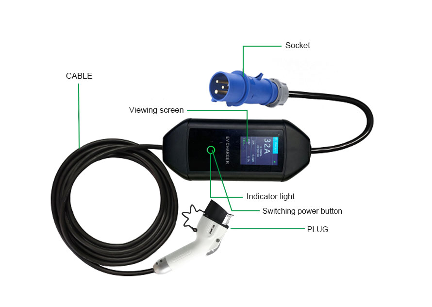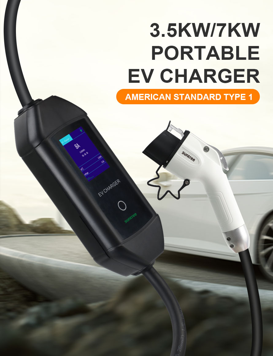 Cargador portátil para vehículos eléctricos (16 A/3,5 kW, 32 A/7 kW), 2,8 pulgadas, estándar americano, tipo 1, certificado CE.