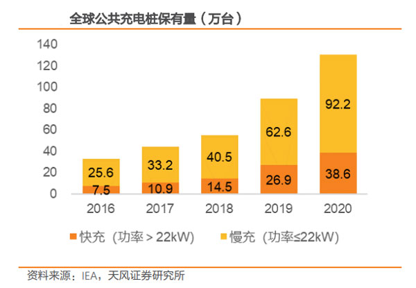 La propiedad global de cargadores públicos de EV será de 1.308 millones de unidades en 2020. Según datos de la IEA, la propiedad global de cargadores públicos de EV ha aumentado rápidamente en los últimos años, con 386,000 cargadores rápidos de EV (potencia > 22 kW) y 922,000 cargadores lentos de EV (potencia ≤ 22 kW) en 2020, y estimamos que la proporción de cargadores públicos globales de EV por vehículo es de aproximadamente 11:1. En términos de países, China tendrá 807,000 cargadores públicos de EV en 2020, que es el primero en el mundo, y los cargadores rápidos de EV representan una proporción mayor. En Europa, hay 286,000 cargadores públicos de EV, con 66,700 en los Países Bajos, 44,700 en Alemania y 33,500 en el Reino Unido.